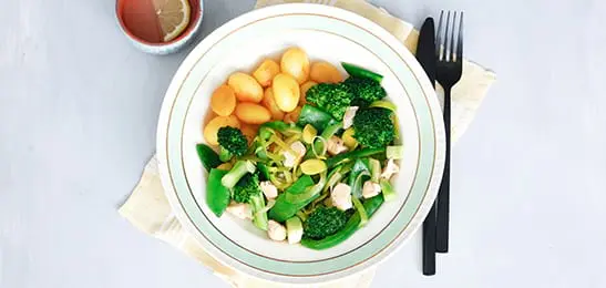 - Breng de roerbak op smaak met wat citroensap en peper. Serveer de krieltjes erbij.