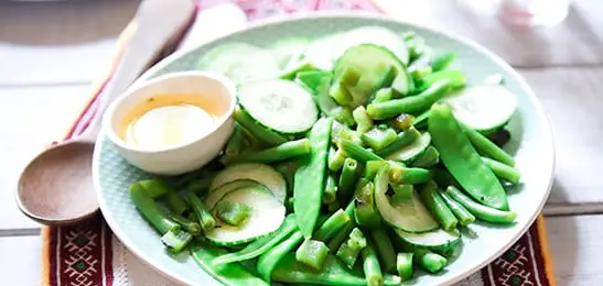Laat de sperziebonen en de peultjes uitlekken en meng de dressing erdoor. Laat dit afkoelen.