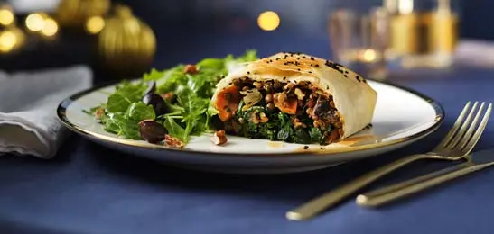Snijd de strudel in stukken en serveer met de salade.