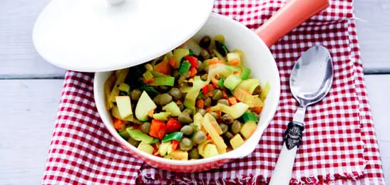 - Doe de kapucijners en de appelblokjes bij de groente en warm het geheel goed door.