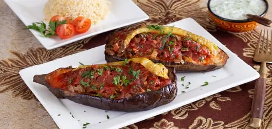 Snijd de gare aubergines in de lengte doormidden. Duw het vruchtvlees wat naar de randen en vul de helften met het gehaktmengsel.