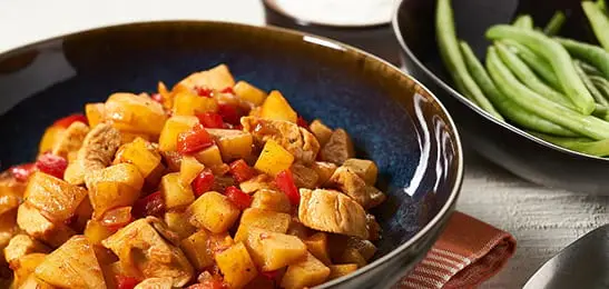 Voeg de paprikablokjes, de aardappelblokjes, het water en het stukje bouillontablet toe en breng dit aan de kook. Kook het gerecht in 10 minuten gaar.