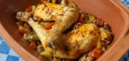 Sluit de schotel met het deksel en zet hem op een rooster in de oven. Zet de oven op 180 °C en laat de kip in 1 uur en 15 minuten gaar worden.
