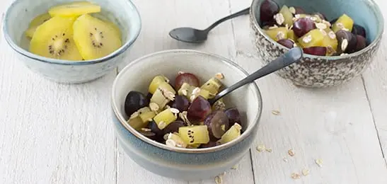 Meng het fruit met het sinaasappelsap en verdeel dit over 2 schaaltjes.