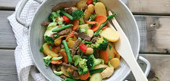 Roerbak de groente op hoog vuur enkele minuten mee.