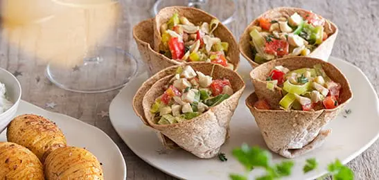 - Snijd de wraps doormidden en vouw elke helft tot een bakje in de muffinvorm.