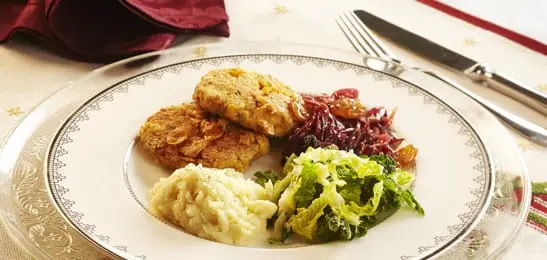 18. Serveer de gestoofde kool, aardappelpuree en uienchutney bij de kikkererwtenkoekjes.