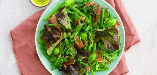 Verdeel de rucola, de rode sla, de sperziebonen en de zalm over twee borden.