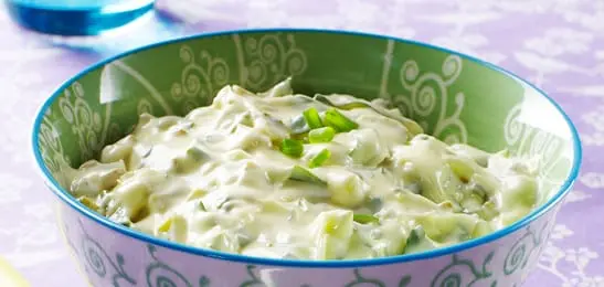 3. Meng de bosuitjes en de kruiden door de yoghurt en klop er de slasaus door.
