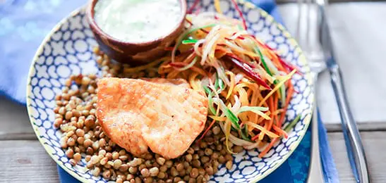 Leg de zalm op de linzen. Serveer de salade en de yoghurtsaus erbij.