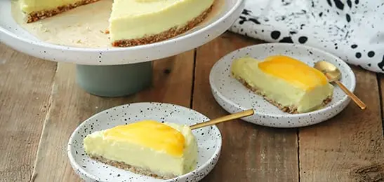 Snijd de taart in 6 punten en decoreer met de rest van de mango.