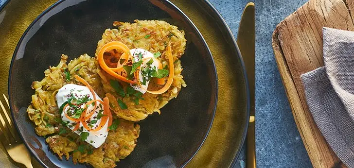 Serveer de aardappelkoekjes met een lepel kwark en verdeel daarover de sumak, de peterselie en de wortel.