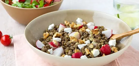 - Meng de walnoten en verkruimelde geitenkaas door de linzen en serveer de salade erbij.