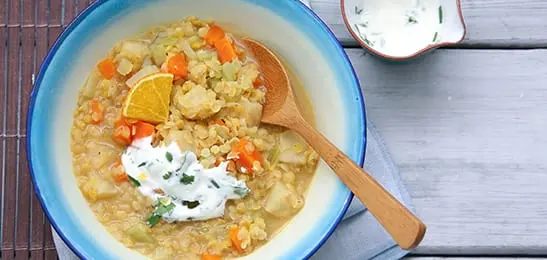 - Garneer de soep met een lepel kruidenyoghurt en leg er een sinaasappel op.