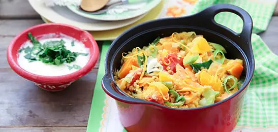 Roer de prei en stukjes sinaasappel door het linzen-groentemengsel en stoof nog een paar minuten.