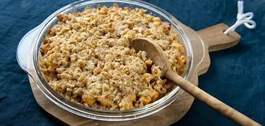 9. Meng de fijngemaakte beschuit met de kaas en strooi dit over de macaroni.