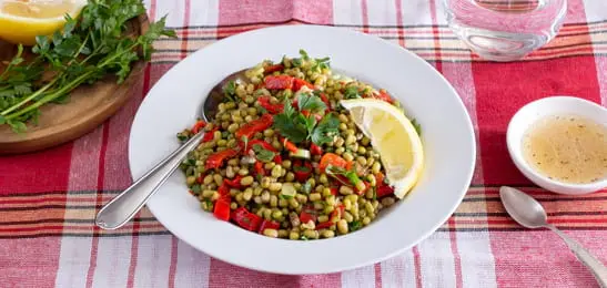 Diëtist Gülsah Kayar schreef het recept voor deze lekkere salade voor ons. Gülsah: "Mungbonen zijn bekend in het Zuid-Oosten van Turkije. Het wordt als salade gegeten, of in de vorm van soep."