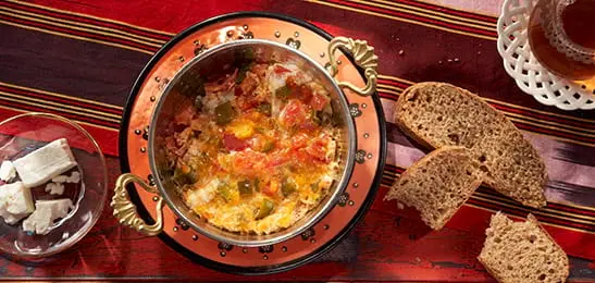 Dit recept met ei, tomaat en groene peper maakte diëtist Gülsah Kayar voor ons. Gülsah: "Wat niet mag ontbreken bij het Turkse (weekend)ontbijt is menemen. Het liefst wordt het gegeten met Turkse pide waarbij er een stuk brood wordt afgebroken als hulpmiddel om een stukje menemen uit de pan te ’lepelen’.”