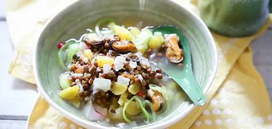 Voeg de mosselen toe en kook de soep nog enkele minuten.