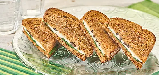 Beleg de helft van de boterhammen met mozzarella, spinazie, olijven en basilicum.
