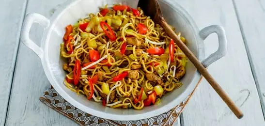 Schep de taugé en de noedels door het kipmengsel en laat het geheel op hoog vuur goed heet worden.