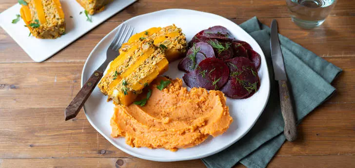 Serveer het notenbrood met de zoete aardappelpuree en bietensalade.