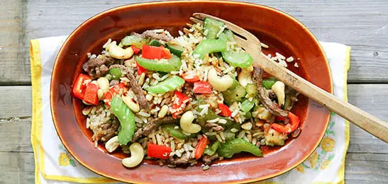 Schep de groente, het vlees en de noten door de gare rijst.