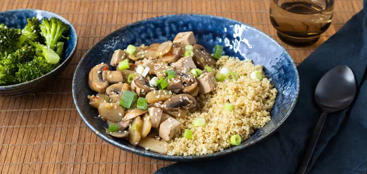 Serveer de quinoa met de paddenstoelenstoof, strooi de rest