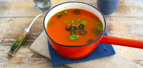 Verdeel de soep over twee borden en garneer met de olijven en de basilicum.