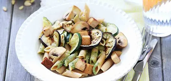Schep de geroosterde groente met het vocht en de tofu op de pasta. Druppel er een beetje citroensap over.