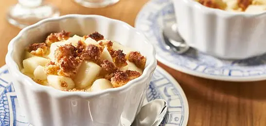 Schep dit mengsel in 2 ovenschaaltjes en verdeel de stukjes peer erover.