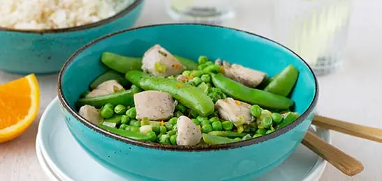 Voeg de peultjes en het sinaasappelsap toe en stoof dit 5 minuten.