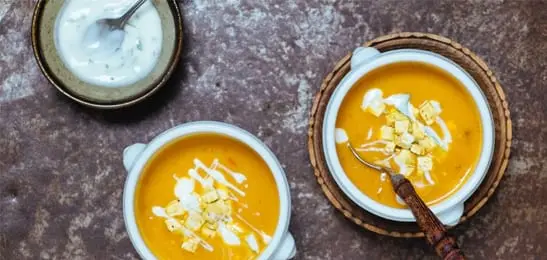 - Garneer de soep met de sojayoghurt en serveer het roggebrood erbij.