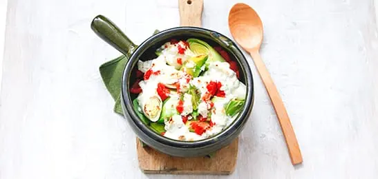Meng de geitenkaas met de yoghurt en verdeel dit over de groente.