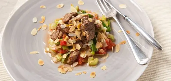 7. Bestrooi het met de amandelsnippers en serveer de rijst erbij.