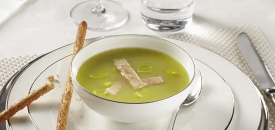 - Maak de prei schoon. Snijd wat hele fijne ringen prei en bewaar ze voor garnering. Snijd de rest van de prei in ringen.
