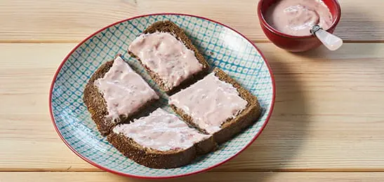 3. Besmeer de boterhammen dun met margarine en met de aardbeienspread.