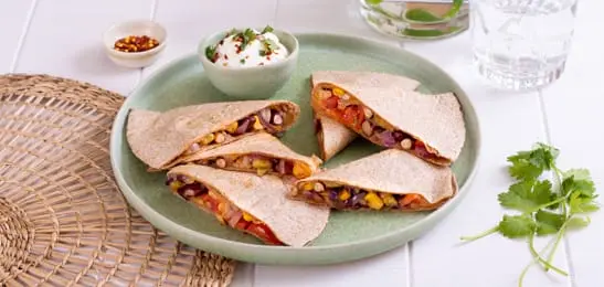 Snijd de quesadilla's in 4 punten en serveer ze met de kwarkdip.