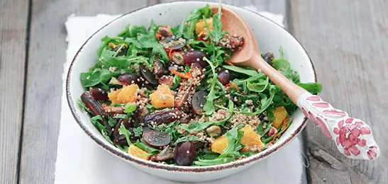 Meng de sla, sinaasappel, druiven, dadels en kruiden door de quinoa. Breng op smaak met peper.