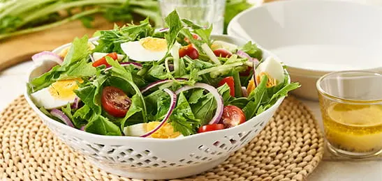 Maak een dressing van de azijn, een beetje water, de mosterd en de helft van de olie.