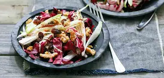 Maak de radicchio en het witlof schoon en snijd de groente in smalle repen.