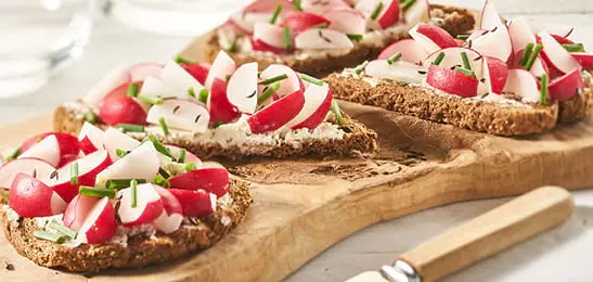 Besmeer de boterhammen met halvarine en de zuivelspread.