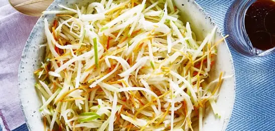 Schil de rammenas en rasp de groente grof. Meng de dressing erdoor.