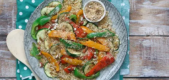 Schep de groente en de pinda’s op de rijst.