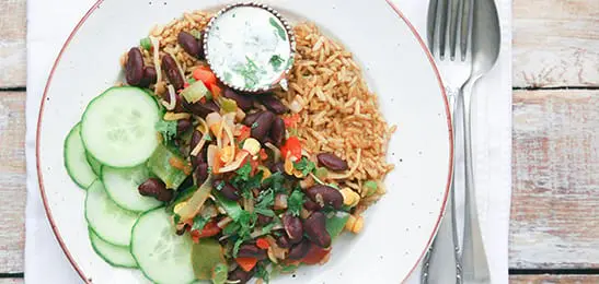 - Serveer de komkommer, yoghurtsaus en chili bij de rijst.