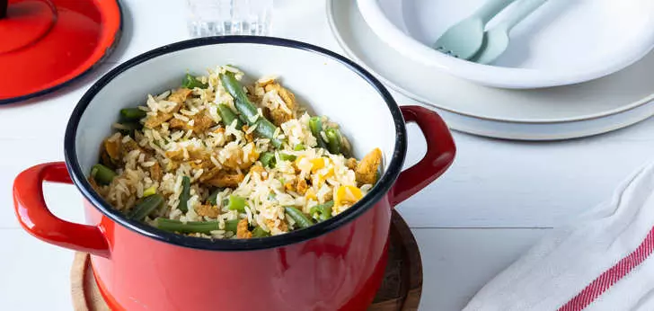 - Meng de sperziebonen en het vlees door de rijst.