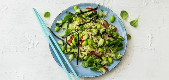In plaats van 1 nori-vel kun je 100 gram zeewiersalade (wakame). Meng dit door de rijst.