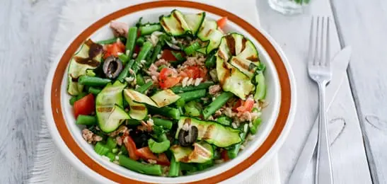 Meng de sperziebonen, bleekselderij, tomaten, olijven en de dressing door de nog warme rijst. Laat dit afkoelen.