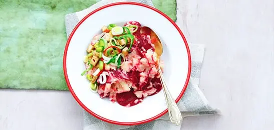 - Maak een stamppot van de aardappelen, sojadrink en bieten.