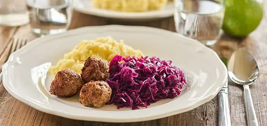 - Breng de rodekool op smaak met azijn en de suiker. Voeg eventueel nog wat kaneel toe. Serveer de gehaktballetjes en de aardappelpuree erbij.